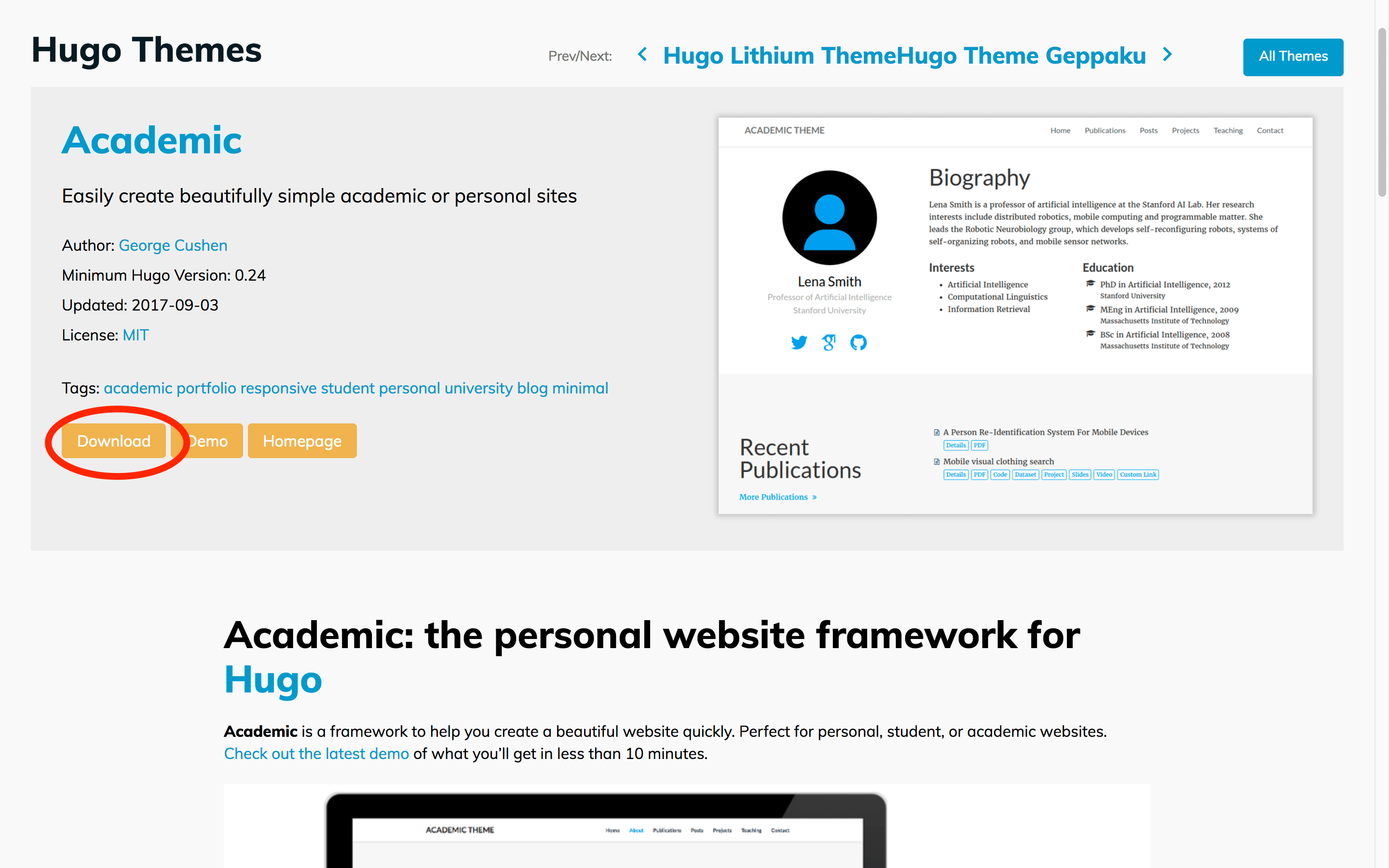 In the “Hugo theme” field you have to insert the URL of the GitHub repository of the theme you would like to use. You will see the address when you click at the thumbnail of the theme and hover your cursor over the “Download”-button.