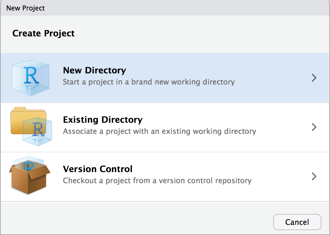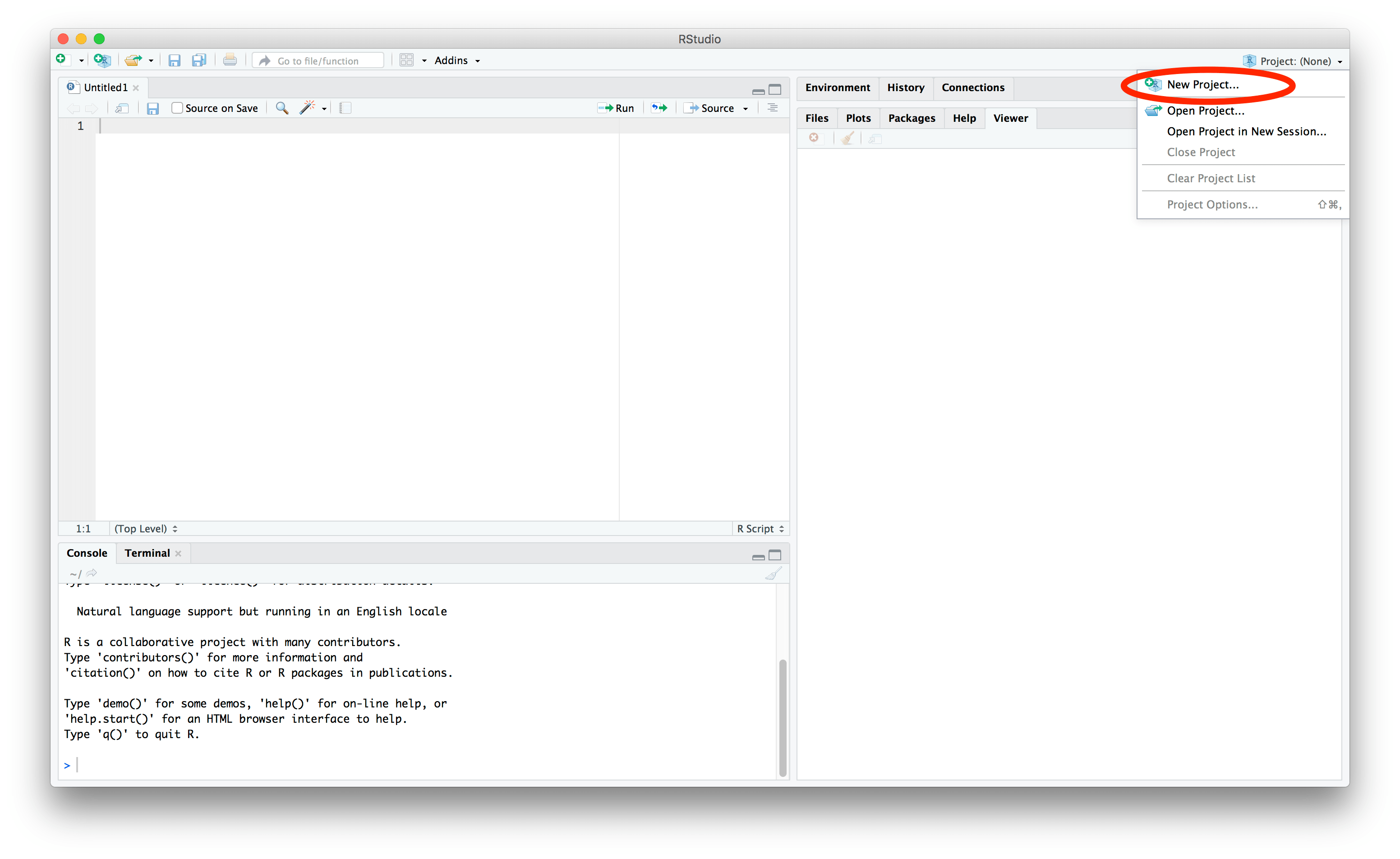 After installing RStudio version greater than v.1.1.28 open the project menu and choose “New Project”.