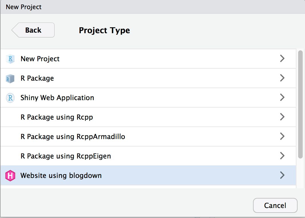 The selection in the following window is self-explaining: “Website using blogdown”. Here it is the last line in the window. But in the future there may added other project types, so that you have to scroll down to see the blogdown-choice.