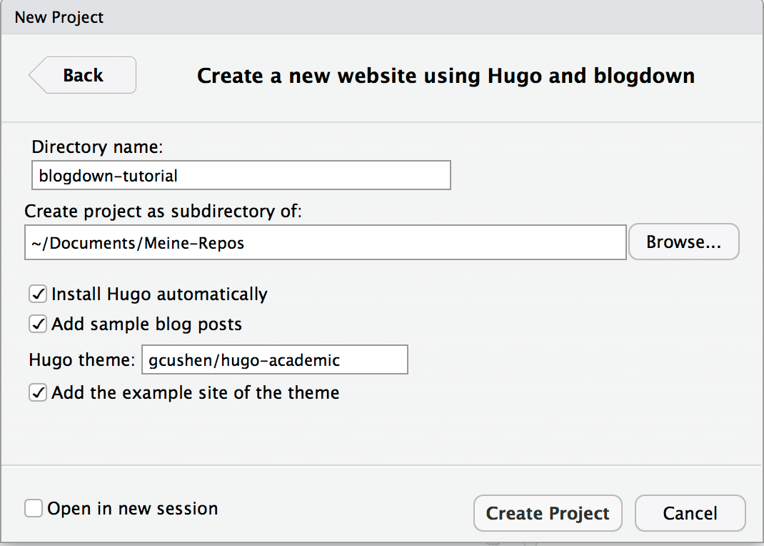 Lastly we arrive at the final window we have to answer. Here you can choose the name and location of your local directory which will eventually collect all files of your static website. I recommend to leave all check boxes ticked, as this default value will give you the most support to generate the new website. The program for the static website generator Hugo will be installed automatically as well as sample blog posts will be added. Especially important is the possibility to look into the example site of the theme, because this will provide you with clues about the functionality of the theme.