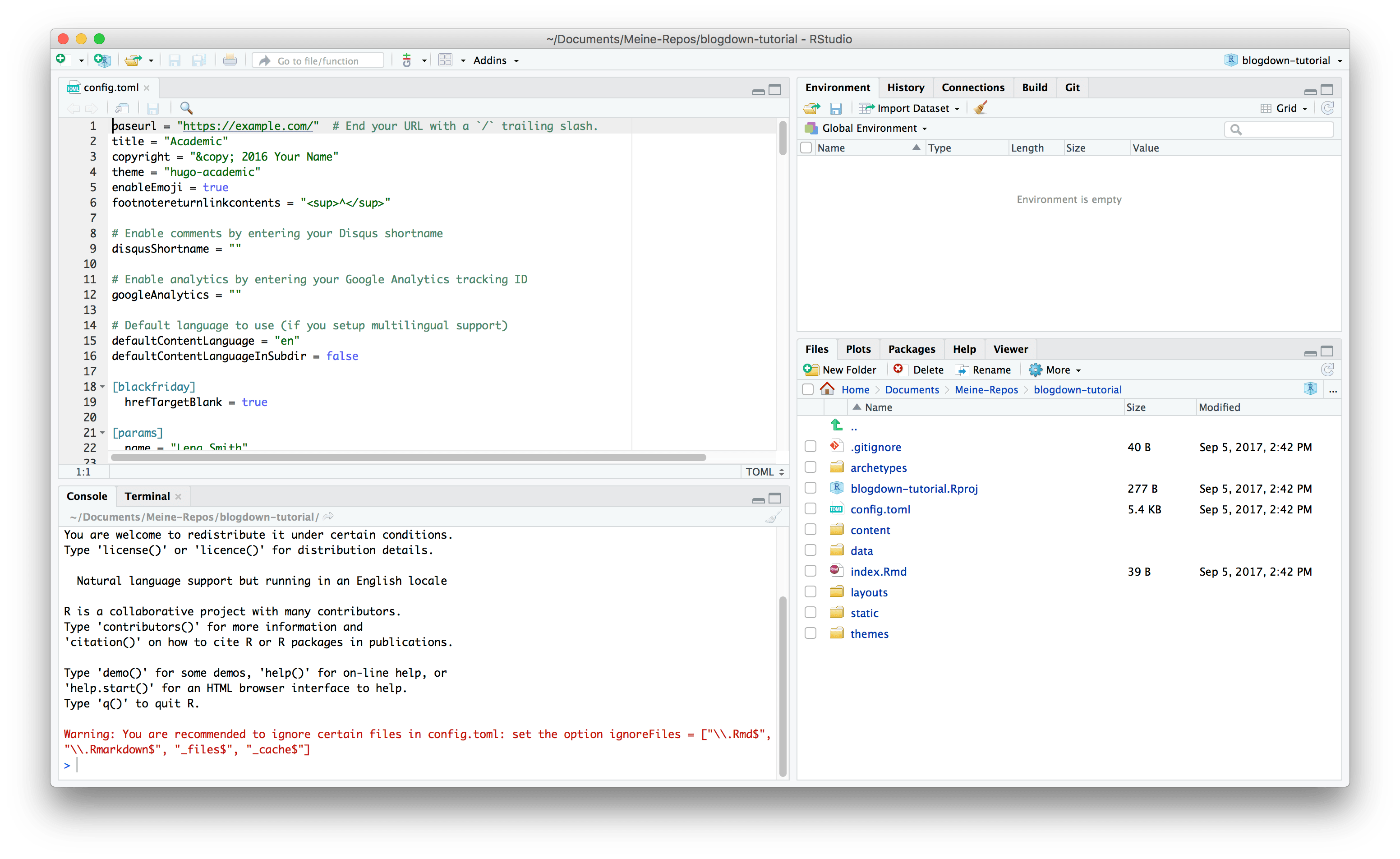 When you finally click the “Create Project” button you have to wait few seconds until the selected theme is downloaded and Hugo installed. After the installation is finished RStudio opens up a four pane view. We will go more into the details of these different windows in the third part of this tutorial.