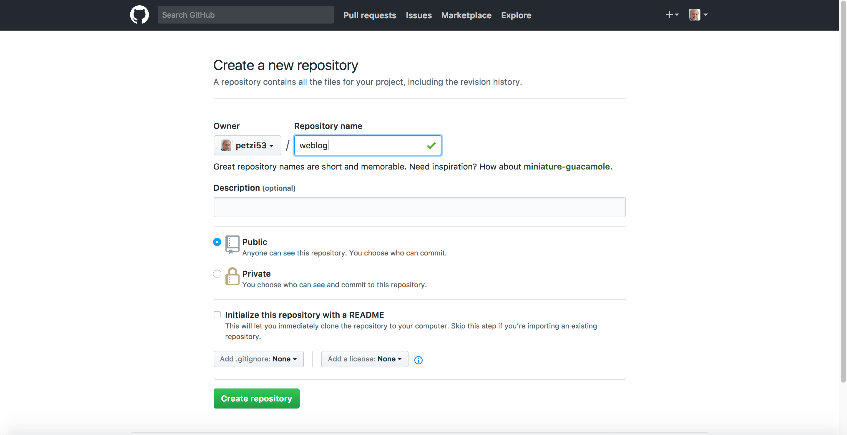 Both actions (“Start a project” and “New repository”) opens up a window where you can name your new repository. Leave all the other options empty resp. as they are and click the green button “Create repository”.