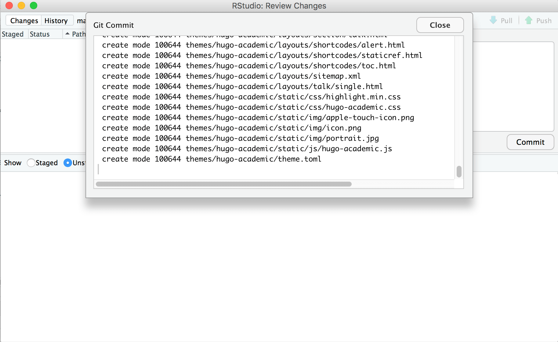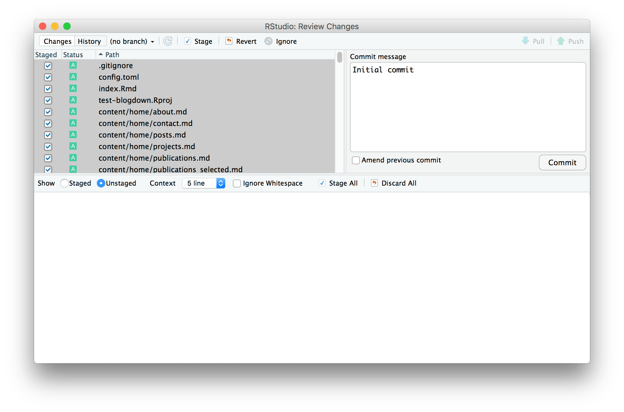 A click in the Commit tab opens up a new window where you must write a message. This is necessary so that all collaborators (including the future-you!) remembers what was the change about. This first (e.g.initial) commit will bring all the files under version control.