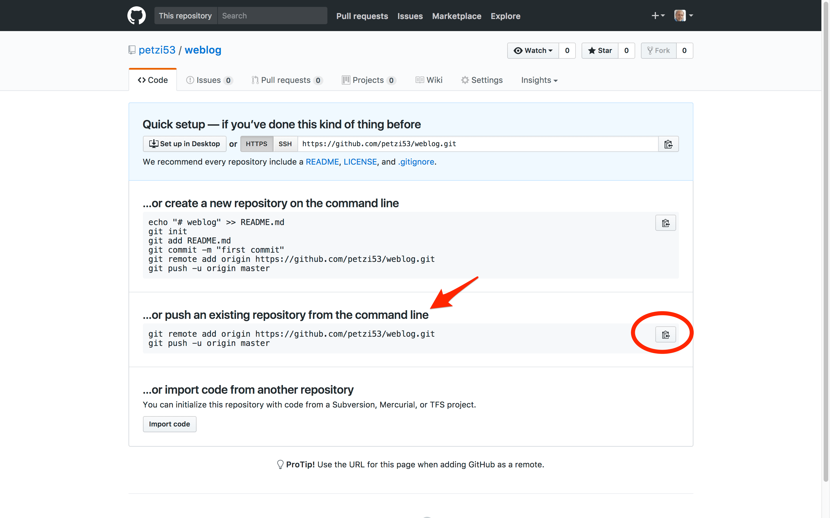 The last click brings you to a “Quick setup” page with several options. As there already exist a repository with our hugo-academic files, we copy the two lines in the third option: “push an existing repository from the command line”.