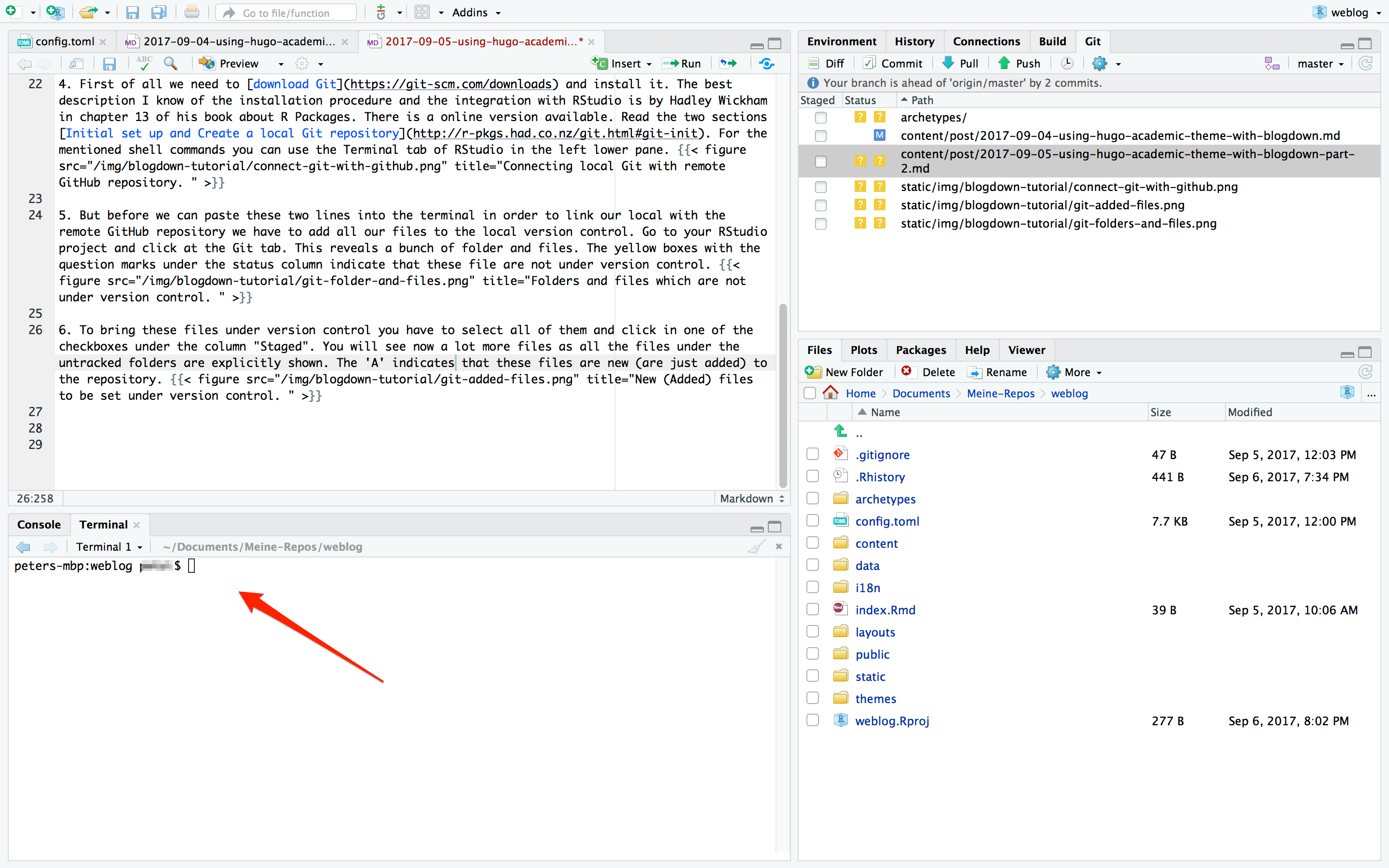 But before we can paste these two lines into the terminal in order to link our local with the remote GitHub repository we need to download Git and install it. The best description I know of the installation procedure and its integration with RStudio is by Hadley Wickham in chapter 13 of his book about R Packages. There is a online version available. Read the two sections Initial set up and Create a local Git repository. For the mentioned shell commands you can use the Terminal tab of RStudio in the left lower pane.