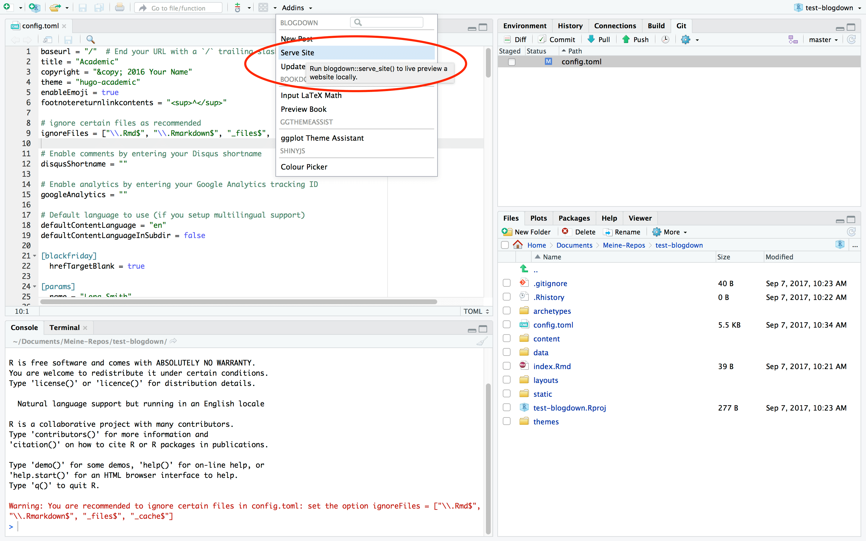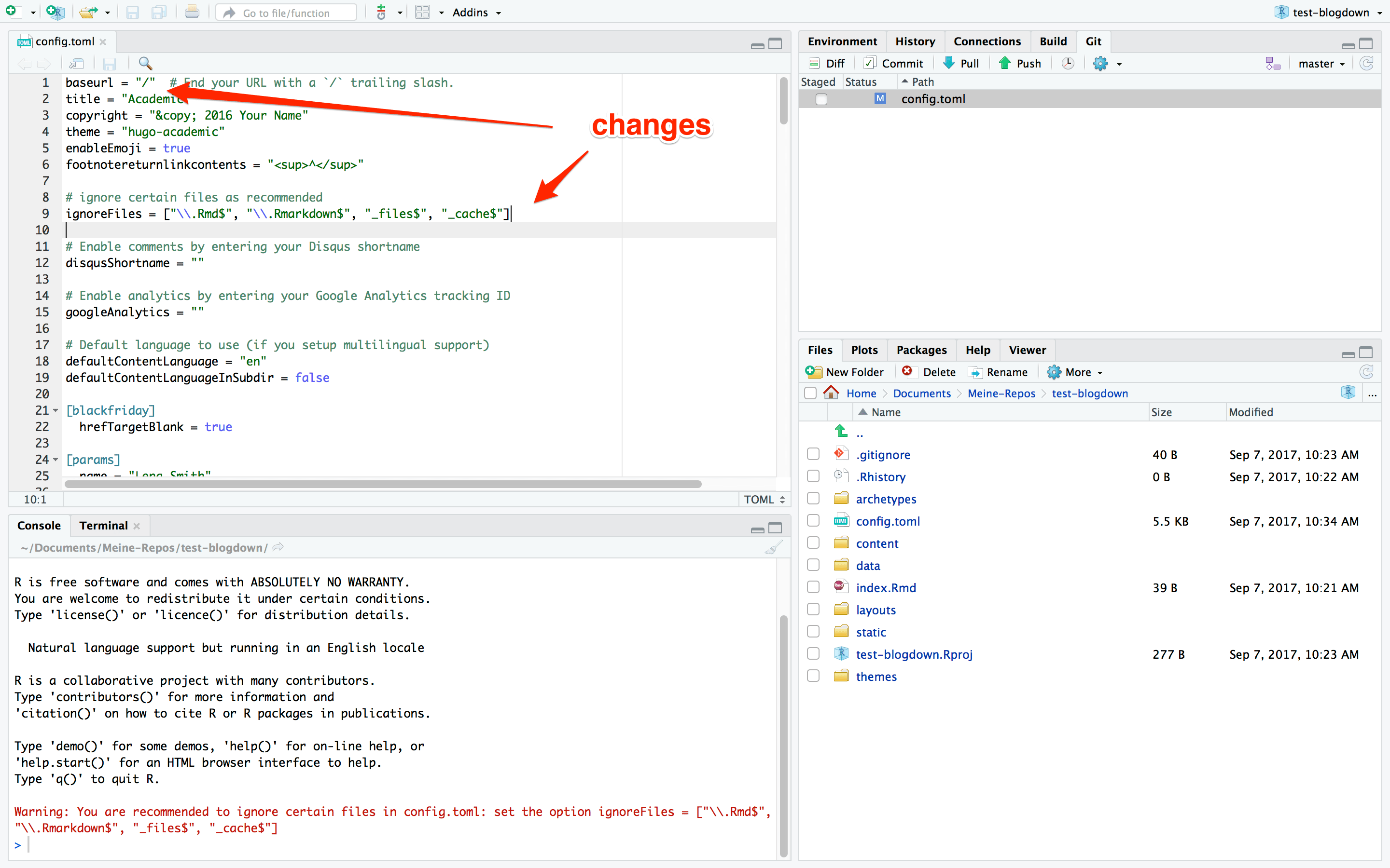 Ignore some file types: After the installation config.toml is opened automatically by RStudio. We add the recommended line ignoreFiles = ["\\.Rmd$", "\\.Rmarkdown$", "_files$", "_cache$"] in an upper place. On this occasion we also change the base URL (first line) to /. After saving theses changes the version control (Git tab right upper pane) will display config.toml with a blue M (modified).