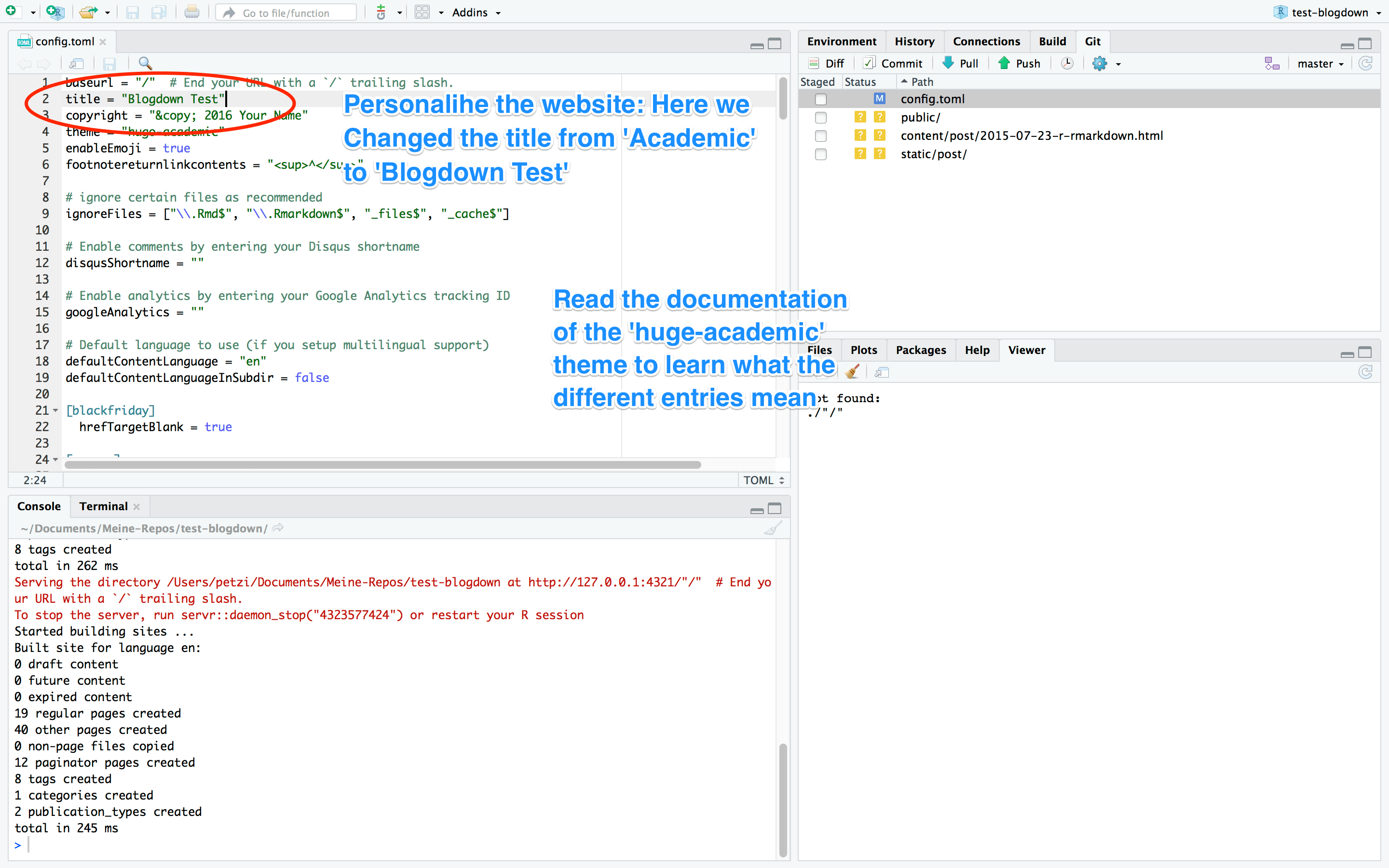Adapt personal information: Until now all the information this tutorial has provided was the same whatever theme you are going to choose from the Hugo theme wsebsite. But from here now comes your specified theme into play we will look into some necessary adaptions before we going to publish our new website. You can now adapt the personal information in your config.toml file. Read the documentation which comes included as posts of the sample site http://127.0.0.1/#post or go directly to the demo site. I have for instance changed the title of the website from ‘Academic’ to ‘Blogdown Test’.