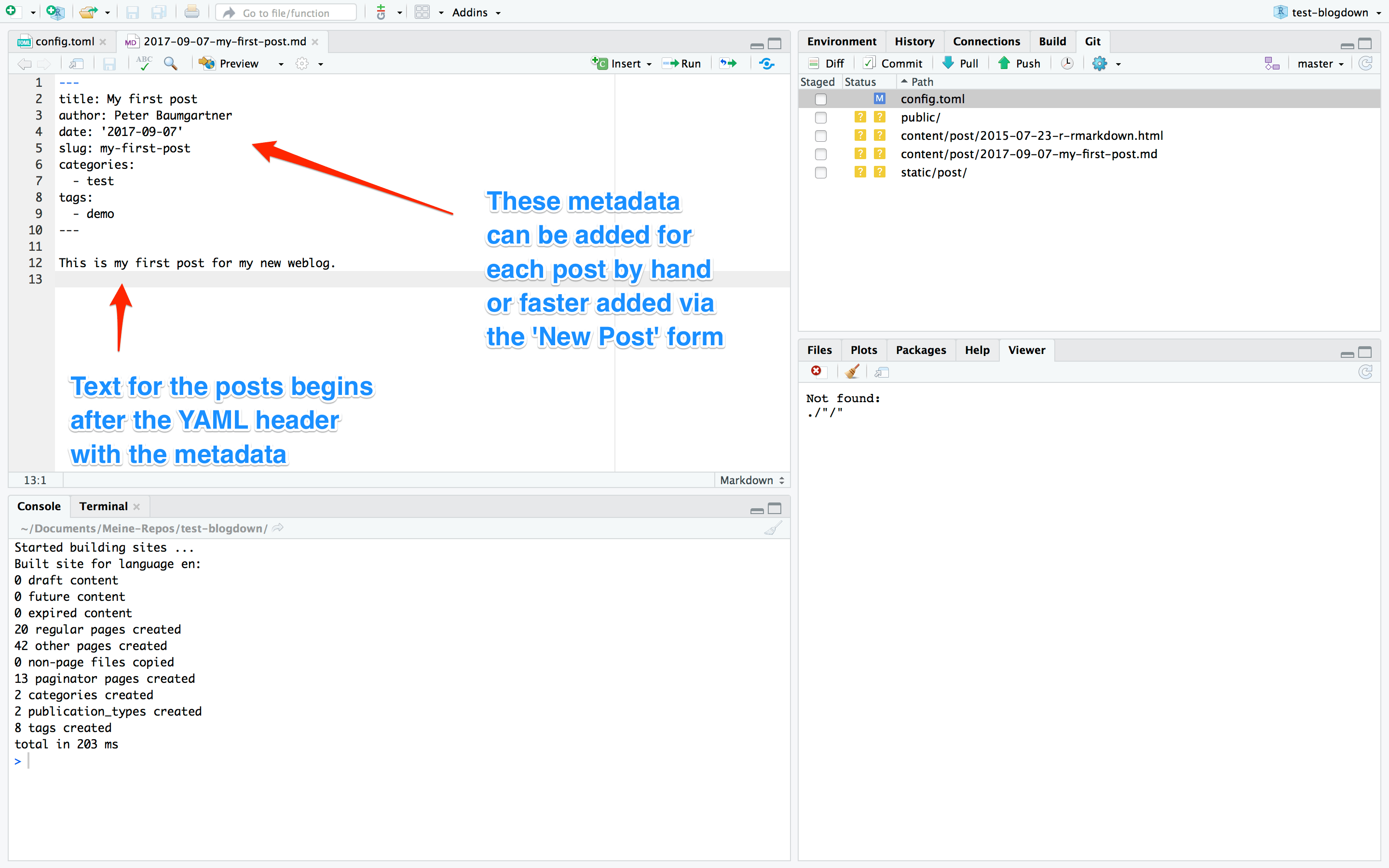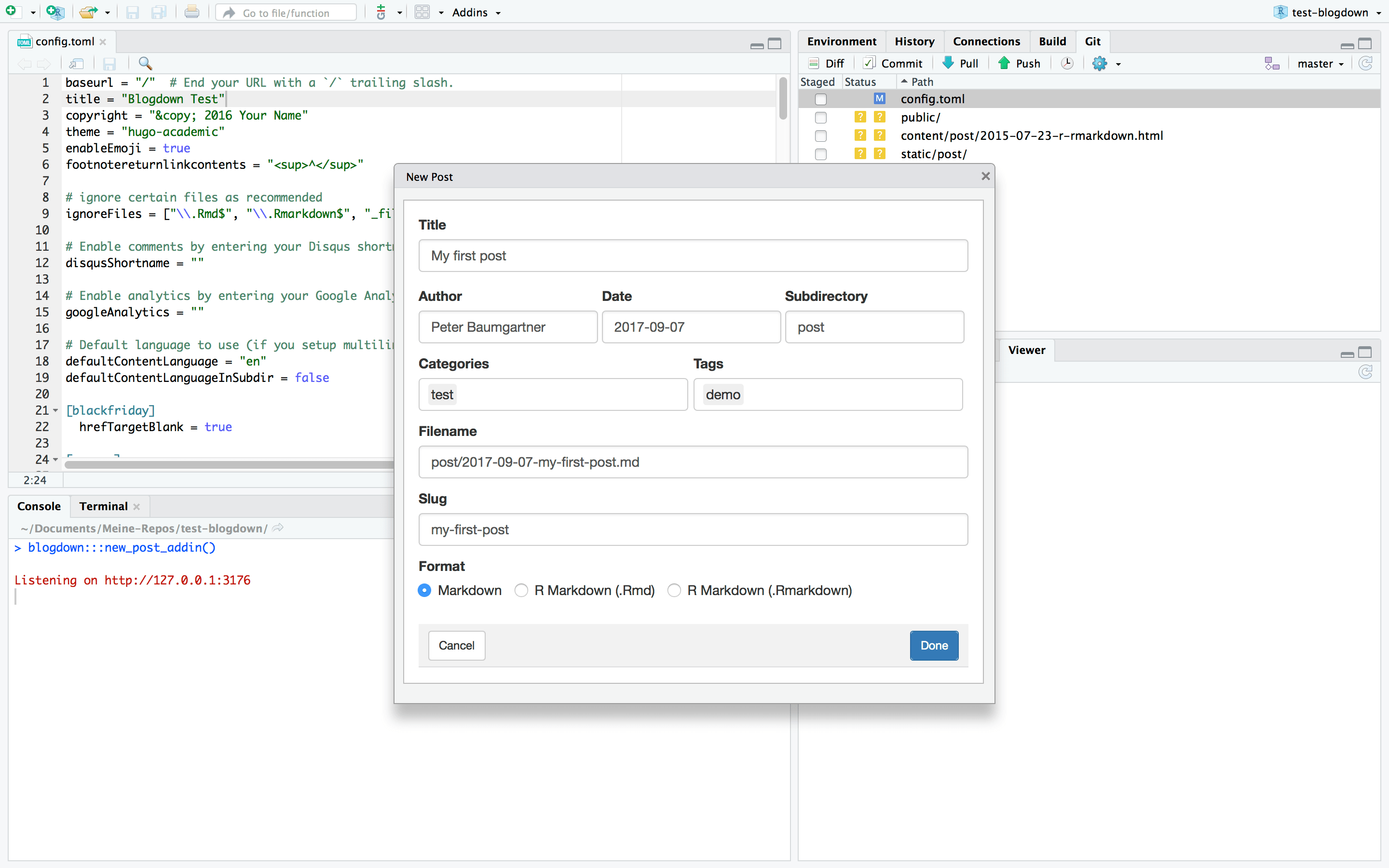 Add metadata: This will open up a window to fill in metadata. This form is already populated with the variable from our .Rprofile, so that you only have to add the post title. File name and slug will be generated automatically from the post title. Categories and tags can be filled now –- or later written in the file header or via the Addins menu ‘Update Metadata’ added.