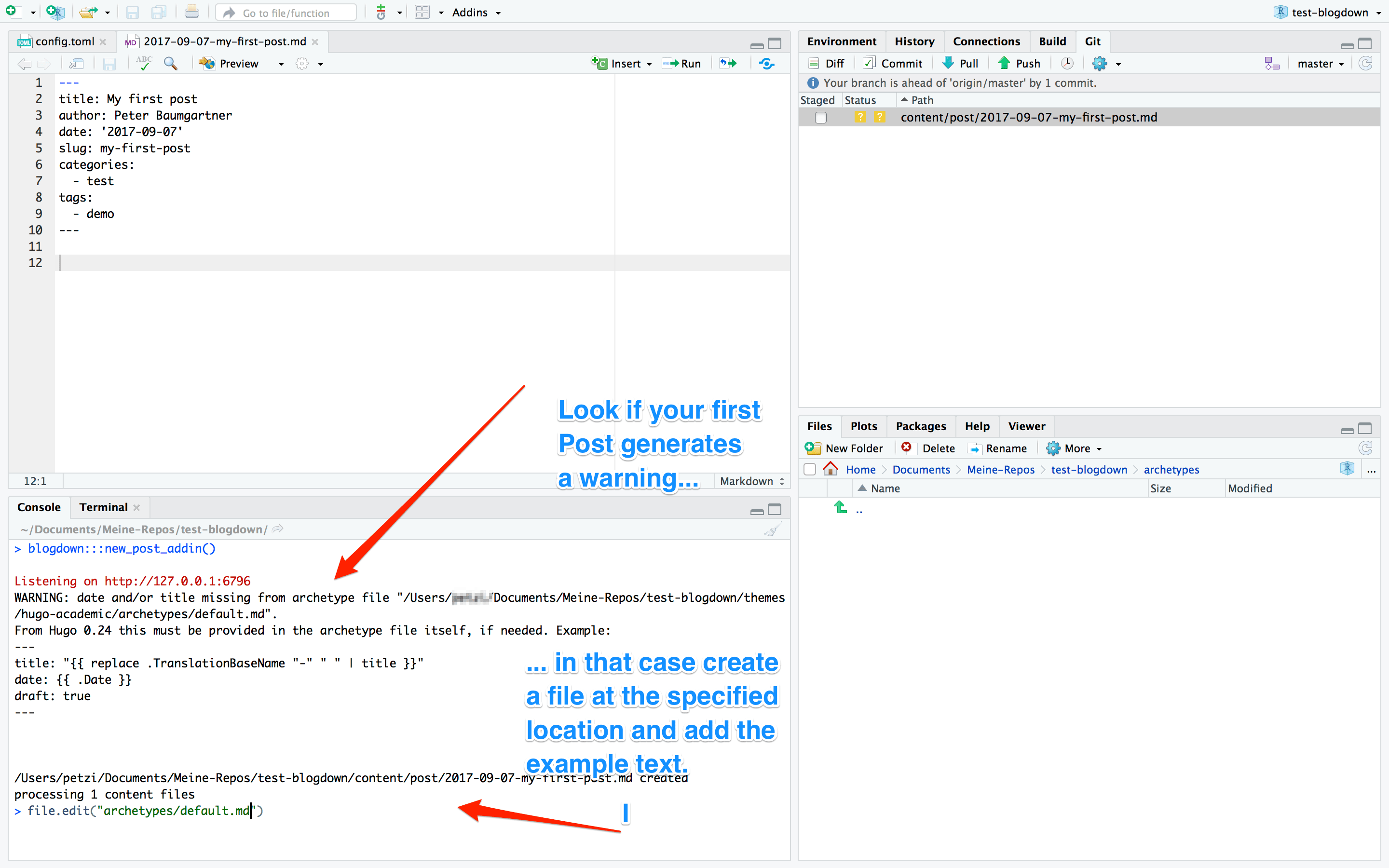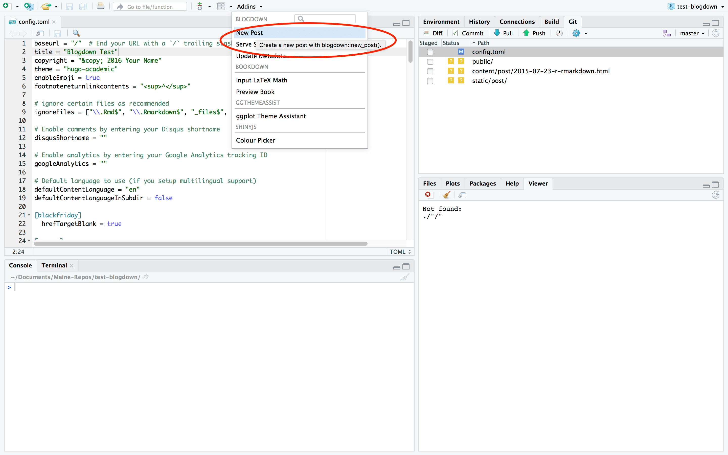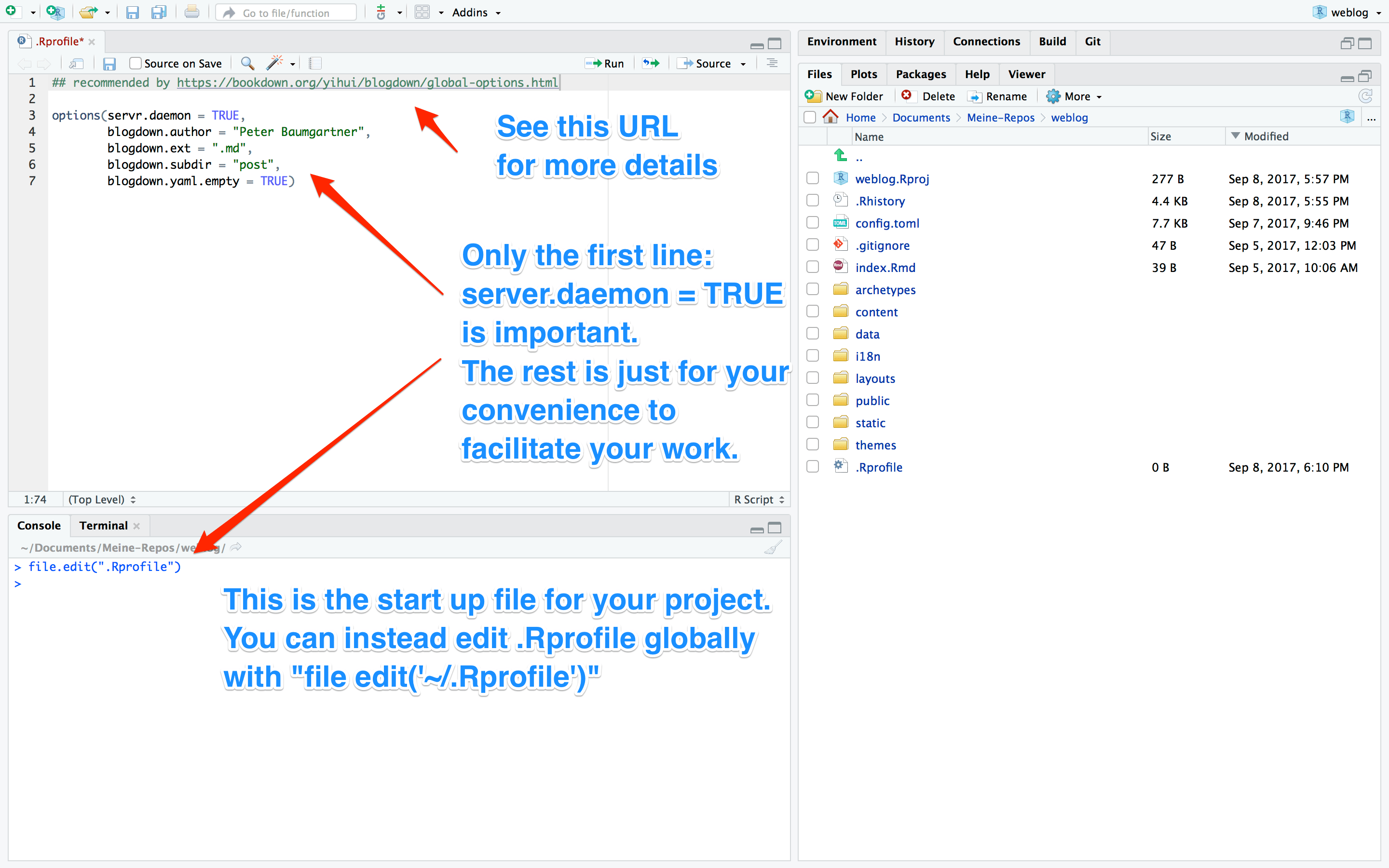 Demonize server: Before we start posting our website locally we should arrange that the local server runs as a background process (= aka to demonize the server). You can run the command options(servr.daemon = TRUE) on the console (lower left pane), but – as I am using this process all the time – I prefer to write this line into my start up file. On this occasion I also add some other convenient commands to facilitate the generation of new posts. See the blogdown page on global options for more details.