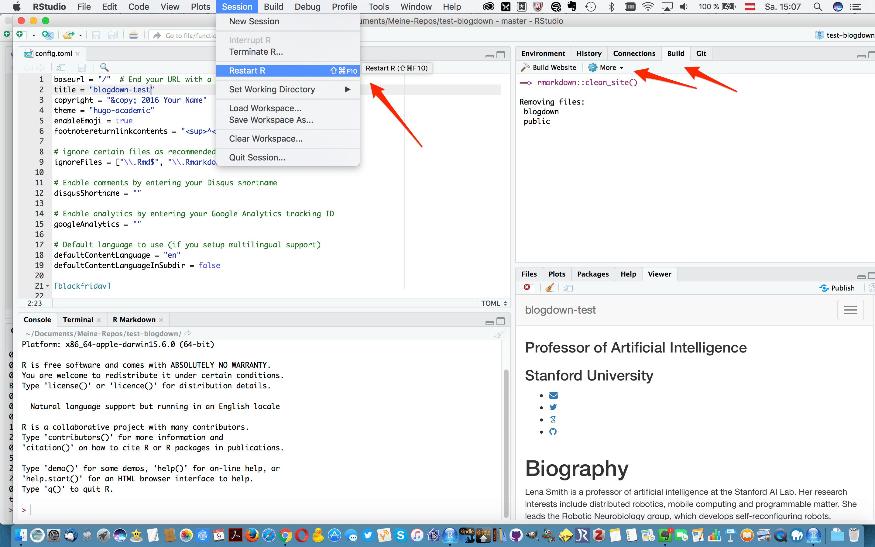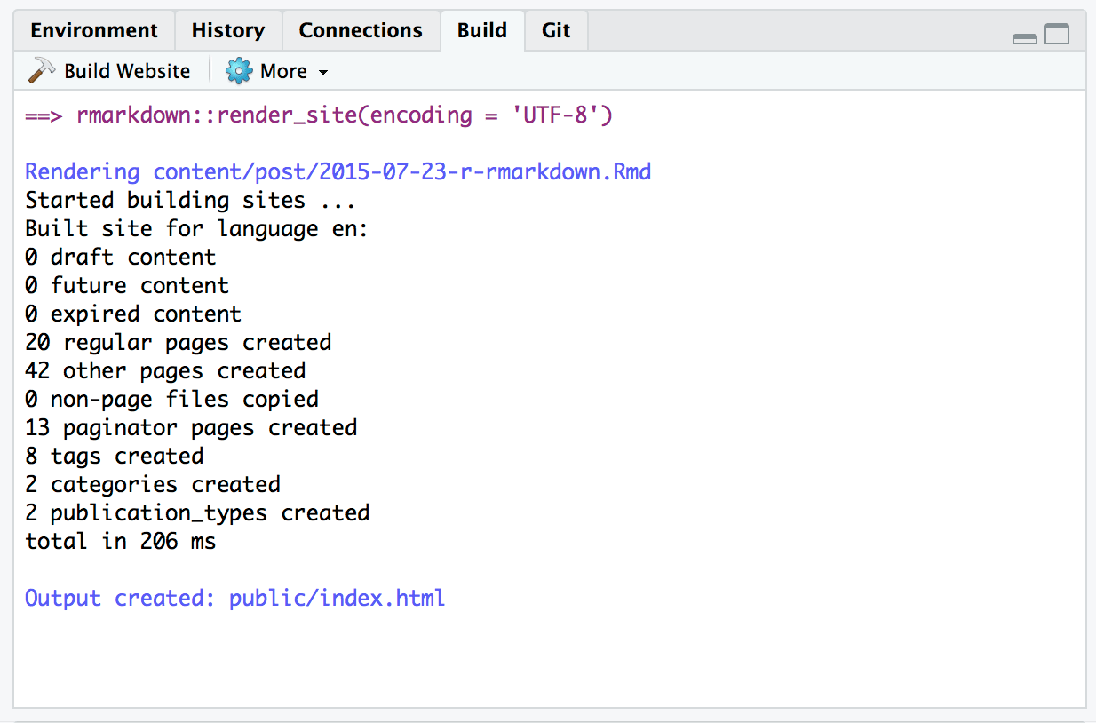 Clean up: Before we are going to rebuild the complete site, I recommend to take some precaution. To rebuild from a clean slate I restart R (Under the RStudio menu ‘Session’ or CMD-Shift-F10 on MacOS.) and clean up all unnecessary files (‘Clean All’ in the ‘Build’ tab under the ‘More’ menu in the upper right pane.)