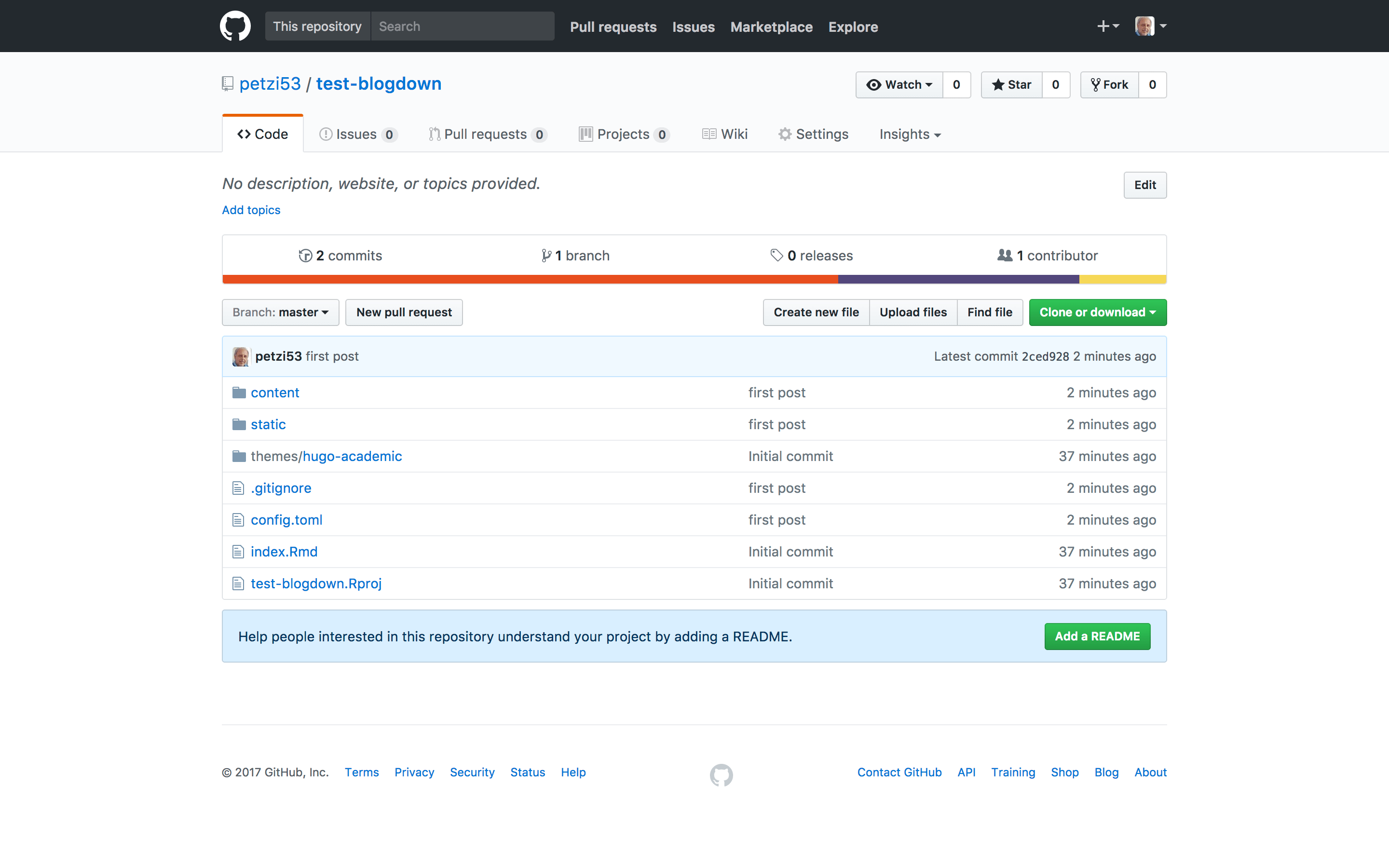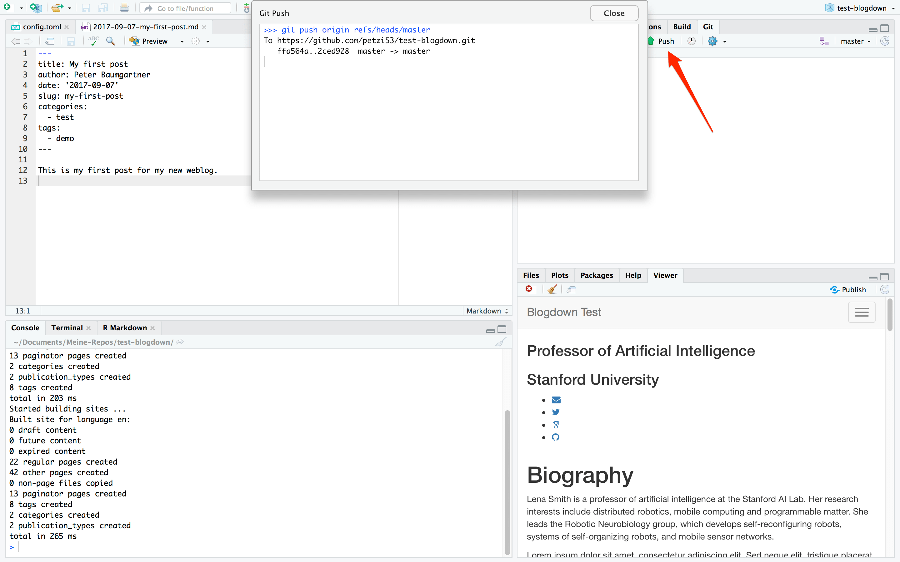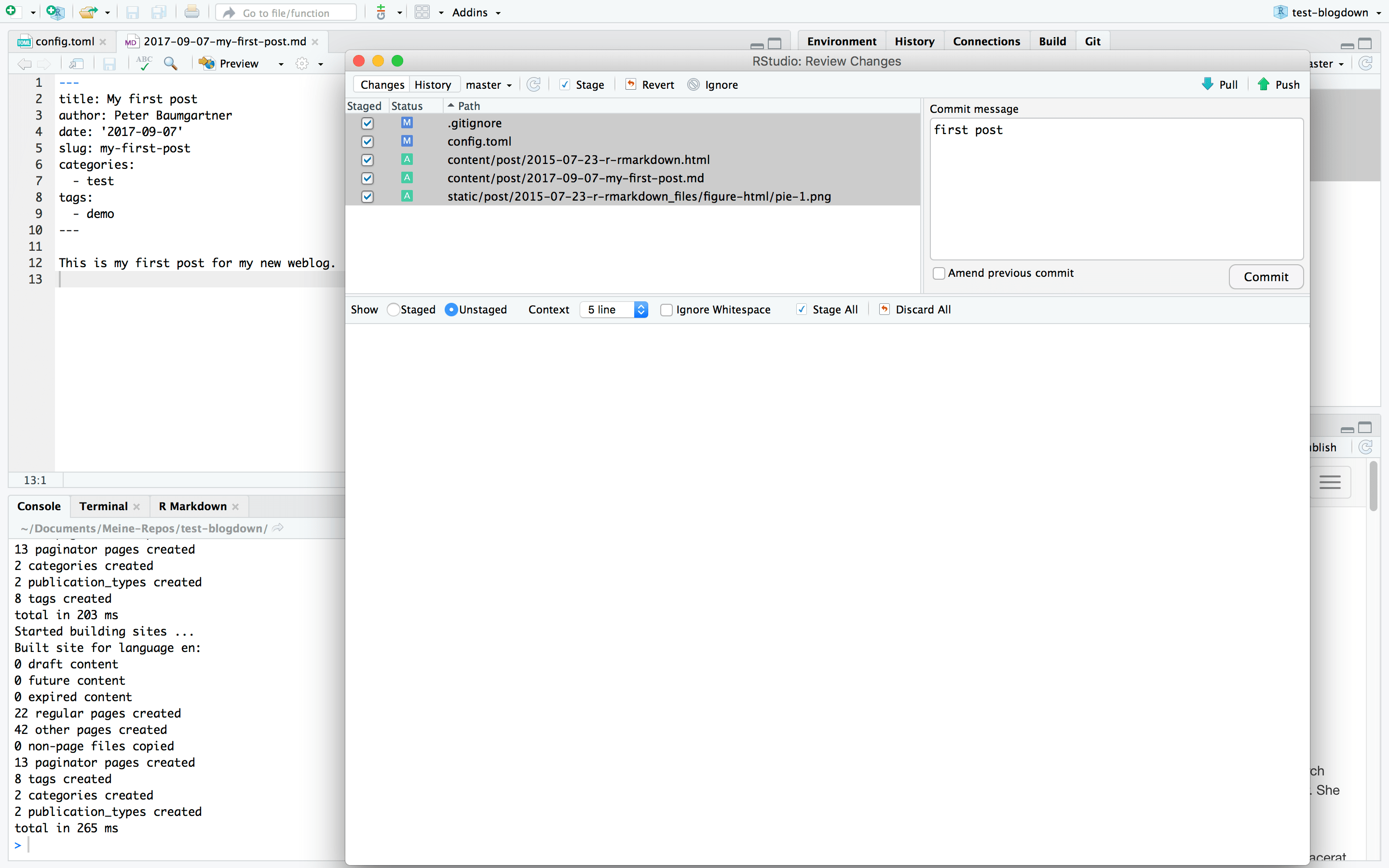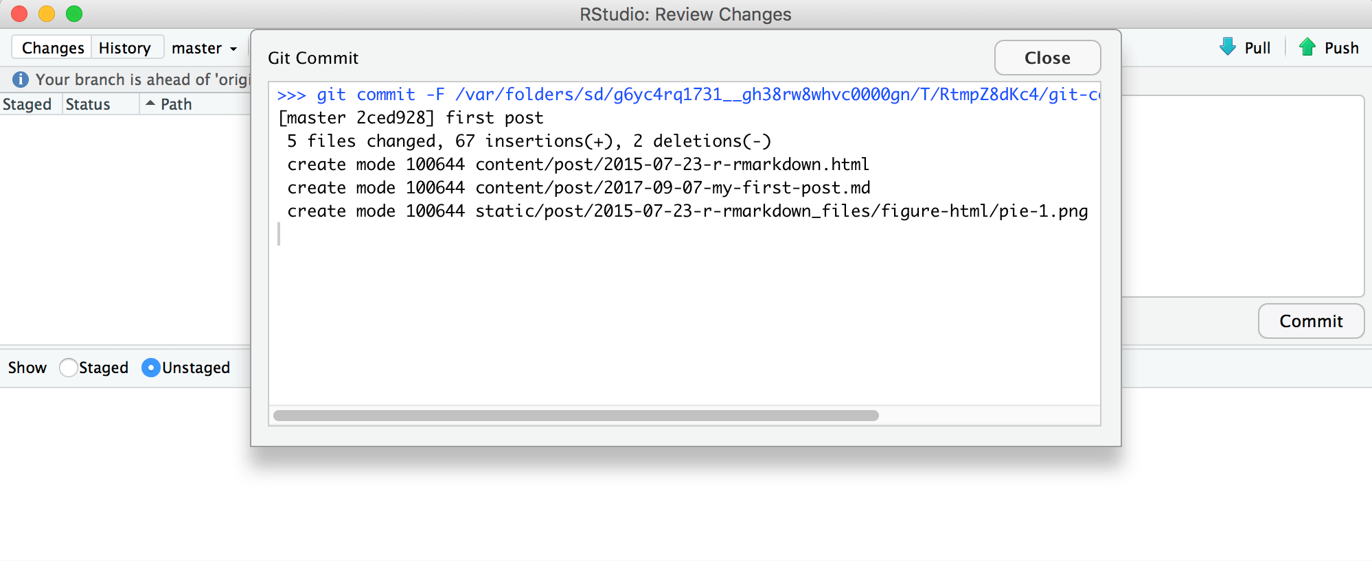 Inspect repo: If you don’t trust this process, you can direct your browser to your GitHub repository and check if really the last commit “First post” has safely arrived.
