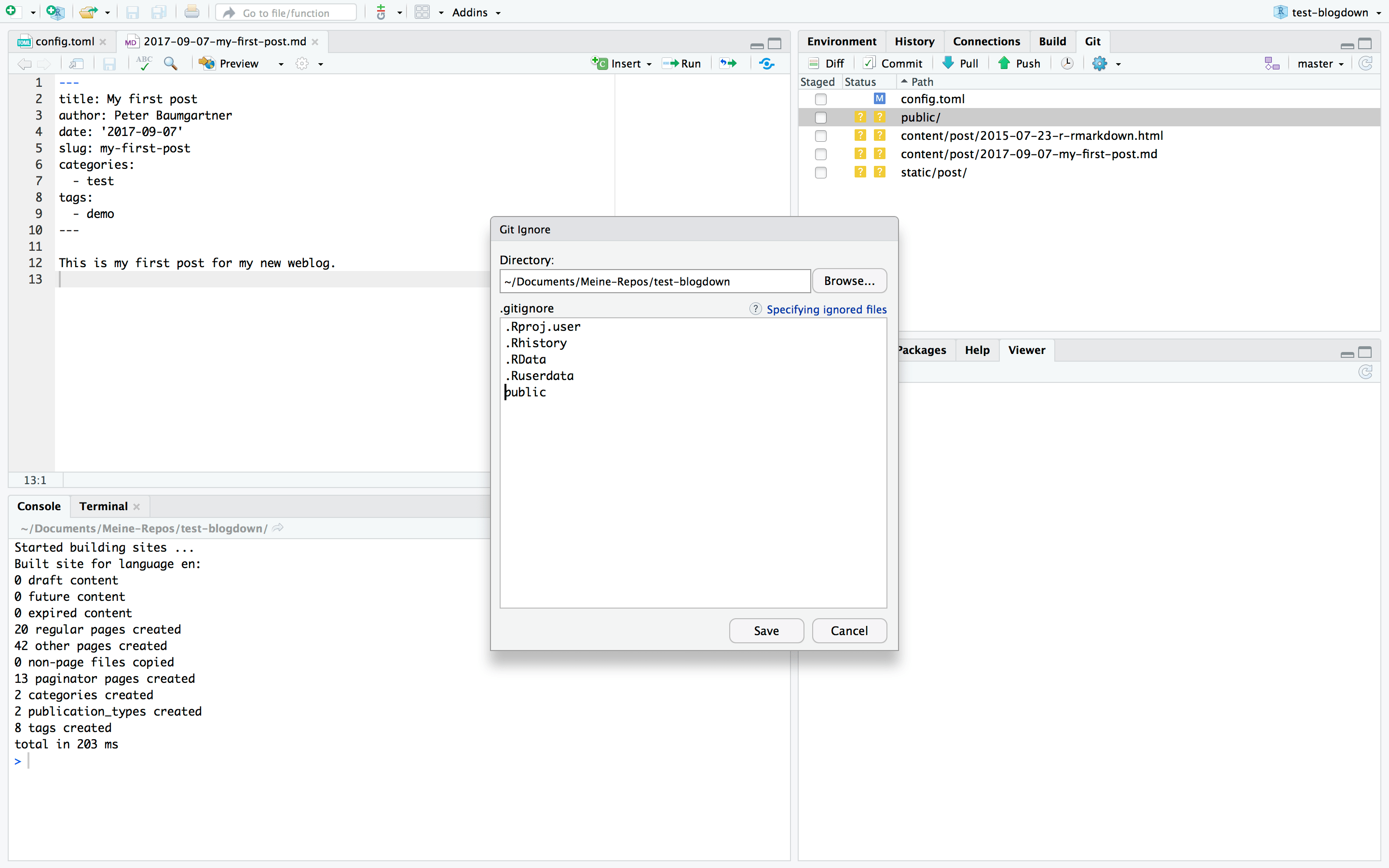 Confirm git ignore: This will bring up a window where you can specify which files are to be ignored. Confirm the inclusion of the public folder with clicking ‘Save’.