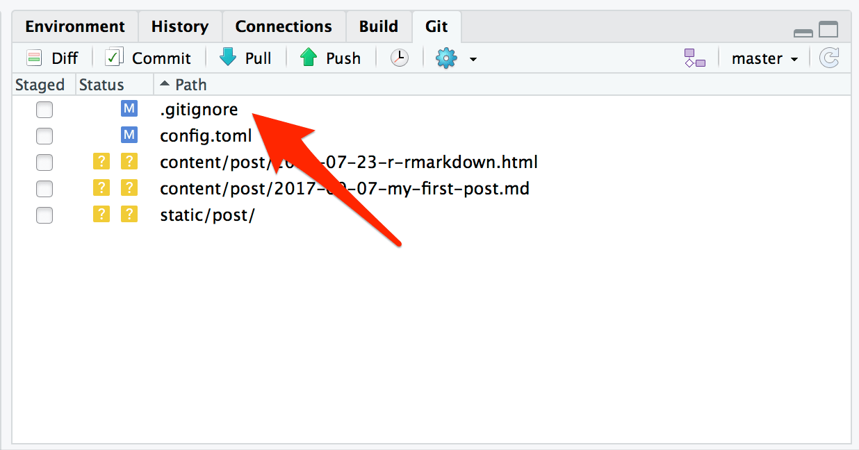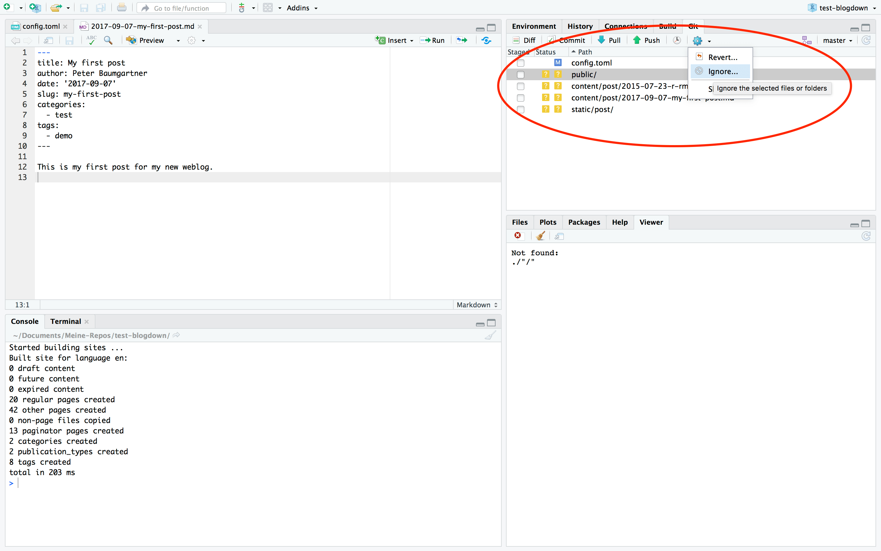 Ignore public folder: One benefit of using Netlify is that that there is no need to upload your large public folder to get your website. Netlify will compile the source files and build by its own the Hugo site. You should take advantage of this feature by telling RStudio that the public-folder does not need version control, committed and uploaded. Select the public folder under the Git tab on the right upper pane and select from the configuration menu ignore….