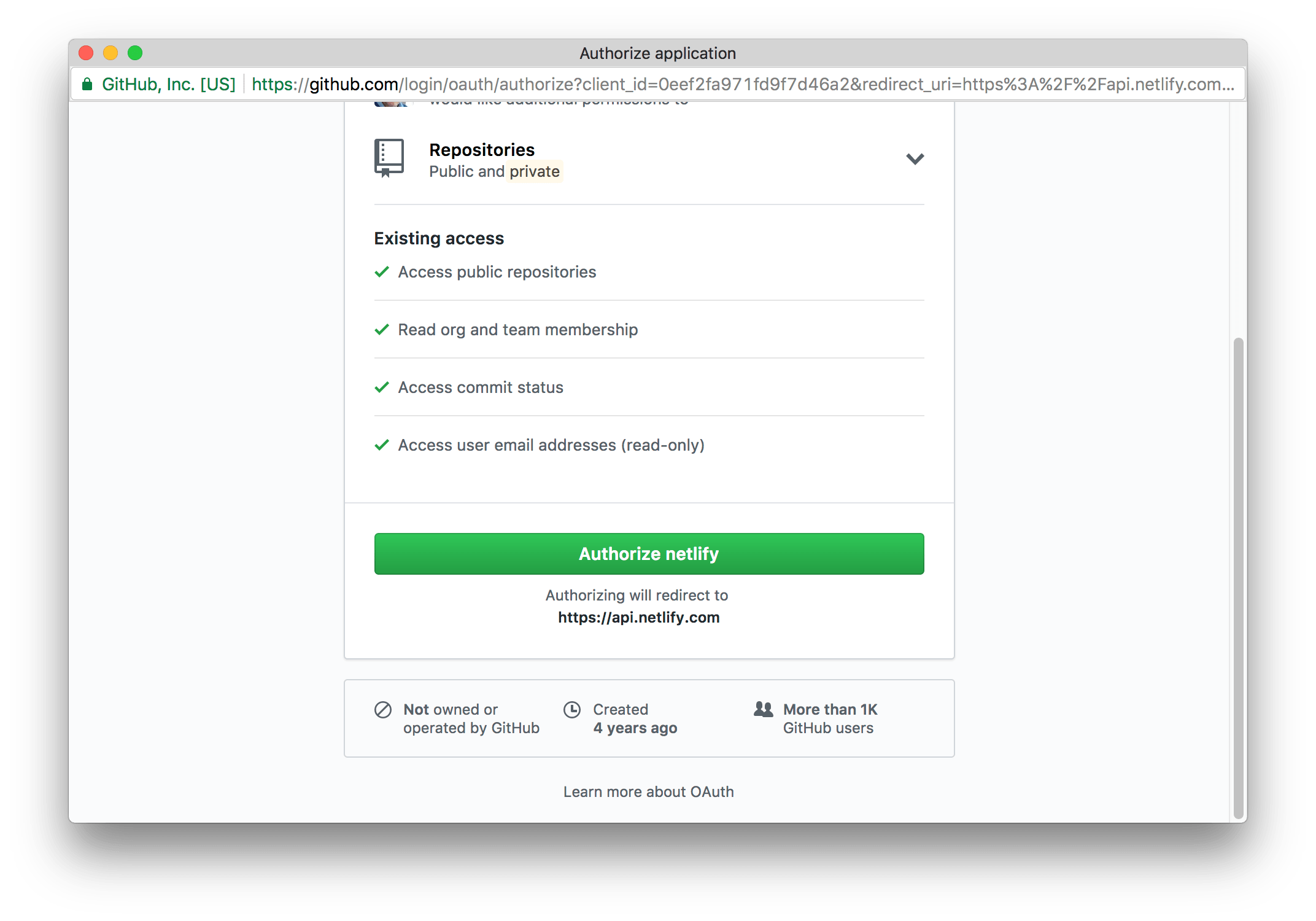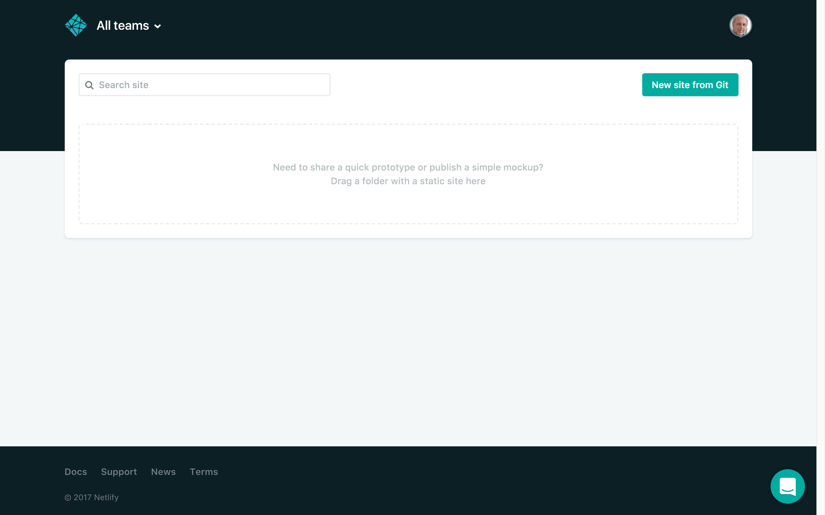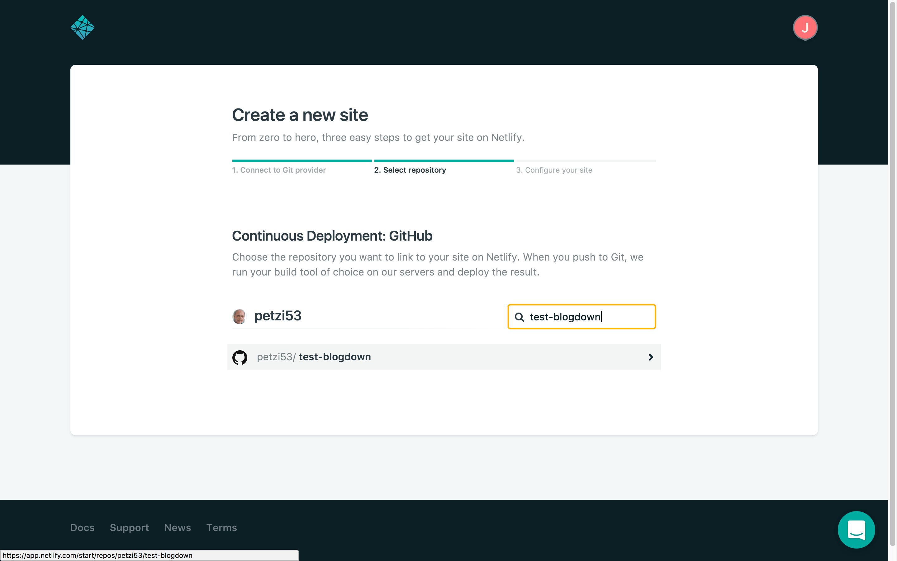 Let Netlify access your repo: After the registration procedure you get page where you can choose ‘New Site from Git’.
