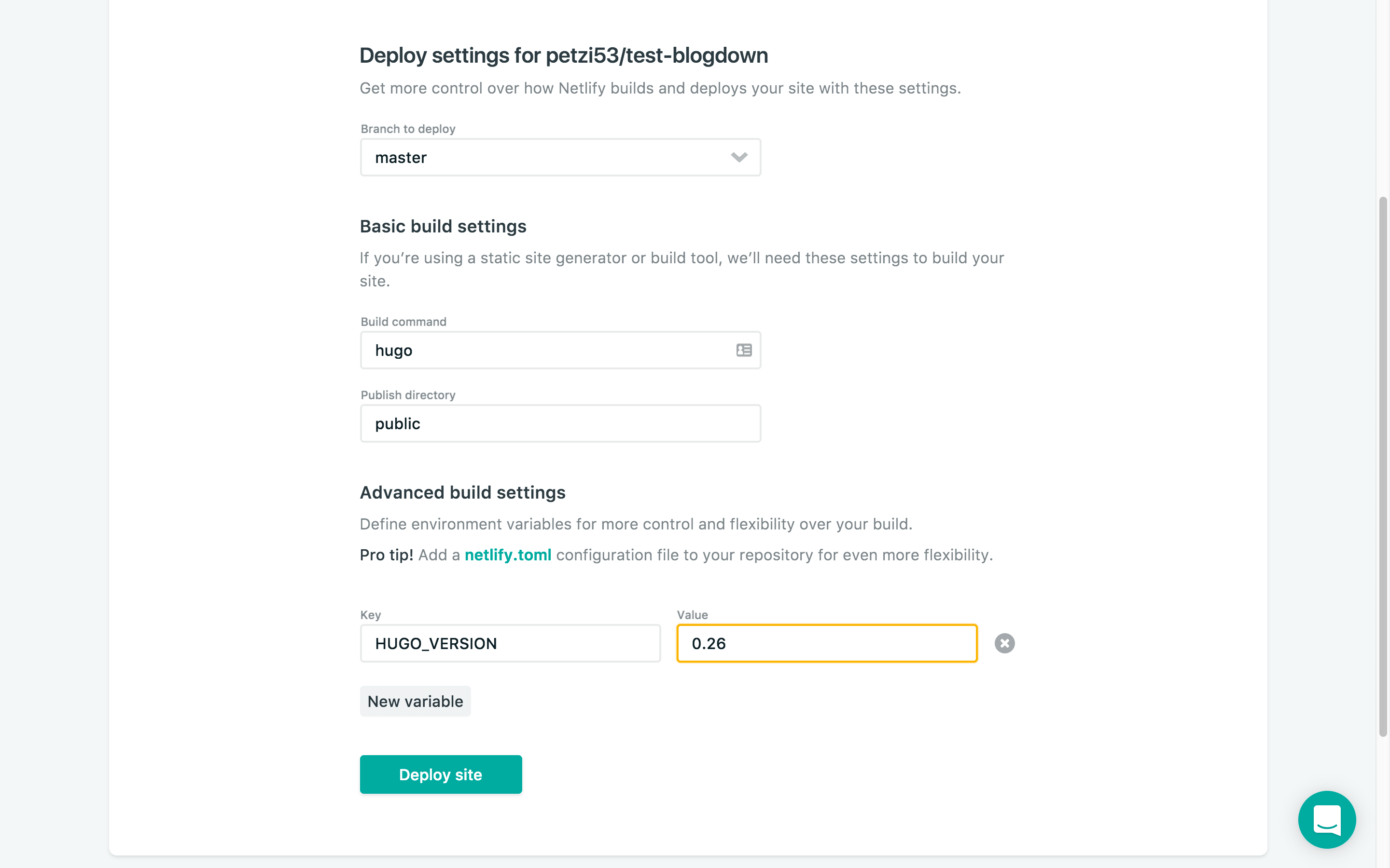 Deploy settings: In the third and last step (C in my former notation) on Netlify to create your website you have to specify the details (parameters) to let Netlify know which type of website it has to build. In the example in the screenshot I said that Netlify should watch my master branch, build a Hugo website from the public repository with the newest version of Hugo at the time of writing this tutorial (version 0.26).