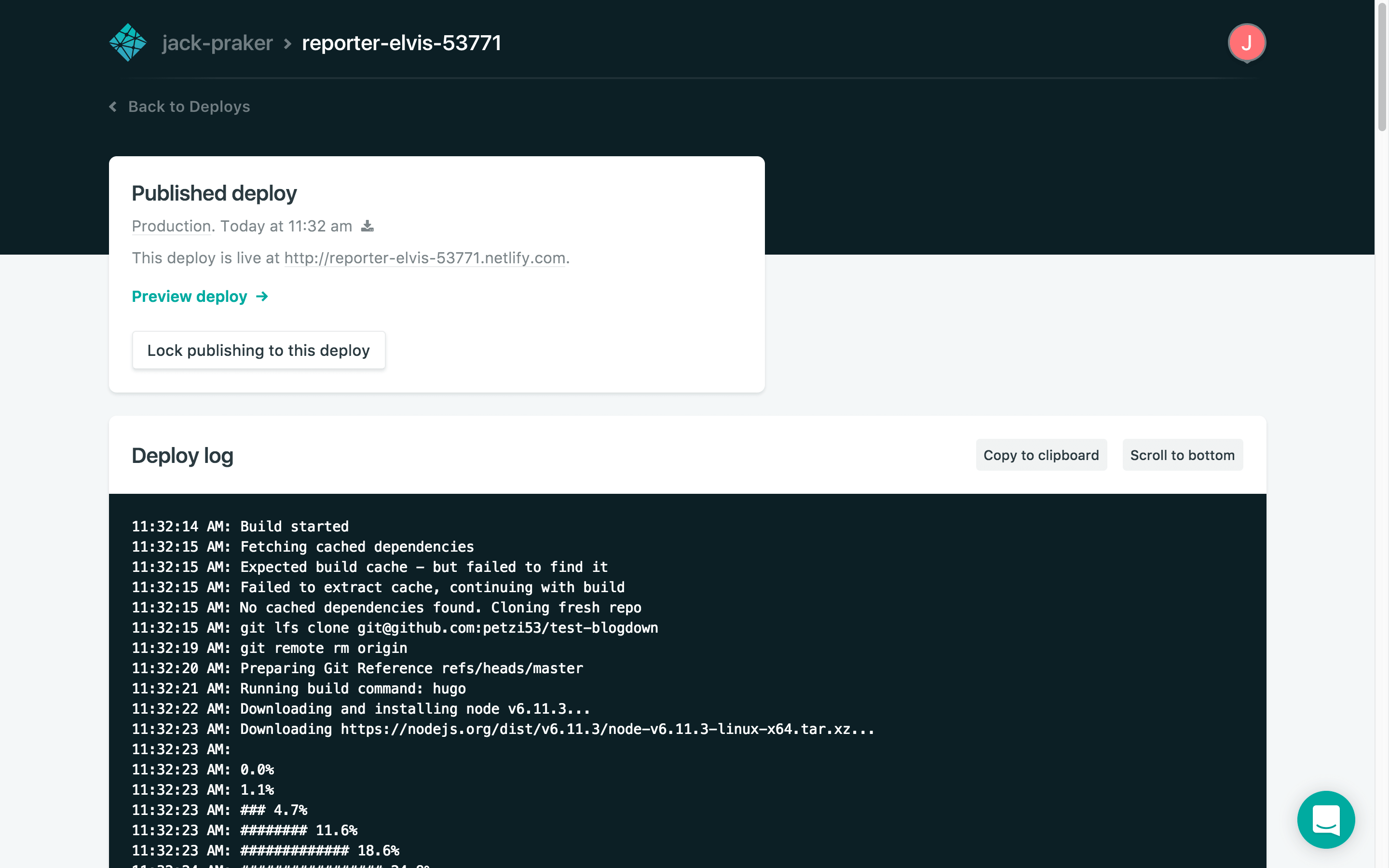 Preview deploy: Scroll back to the beginning of the log messages. You will see that Netlify has giving you a random URL but you can change this later on to your liking. Click “Preview deploy” to go to the URL of your new website.