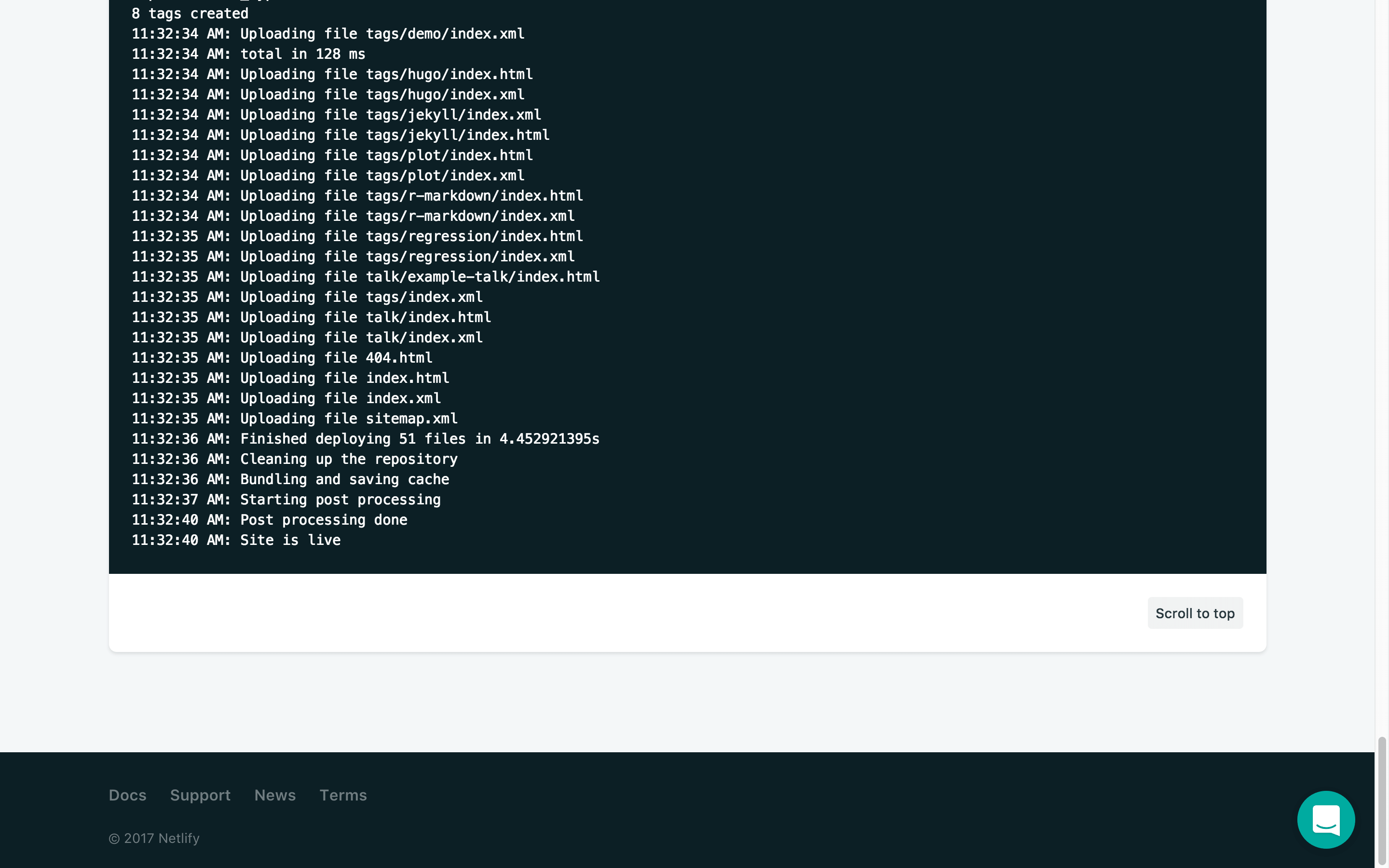 Deploy website: After clicking “Deploy website” you can lean back and watch Netlify busy working on building the website. This may take for this initial step some time but later on Netlify will finish work almost immediately as it only builds the new/changed files incrementally. When the rolling down of the messages stops you should see as last line: “Site is live”!