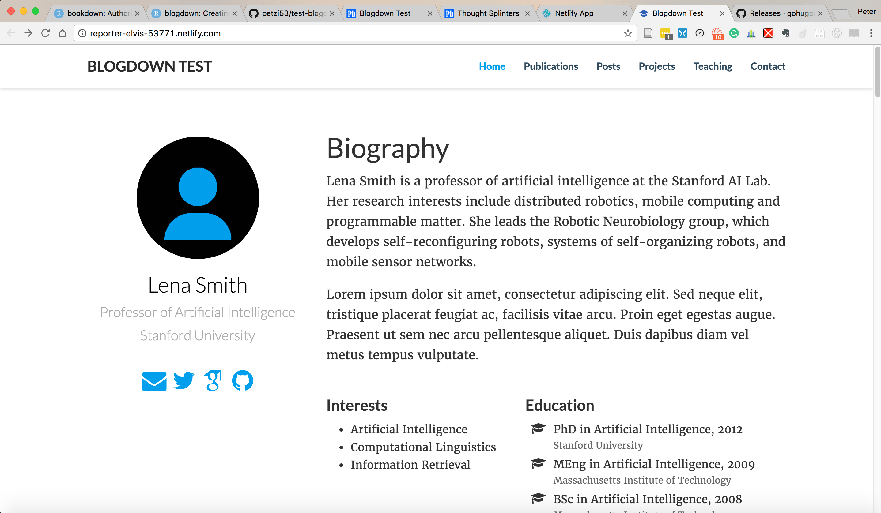 This was a very quick tour where I have covered just the things I believed to be essential. If you are (like me) new to static website generators then the different steps together seem overwhelmingly complex. But with patience and some trial and errors you should succeed — as I have. There are many other (better) tutorials and How-Tos around. You should definitely read carefully the book blogdown: Creating websites with R Markdown and the reports of different experiences from the new rbind community.